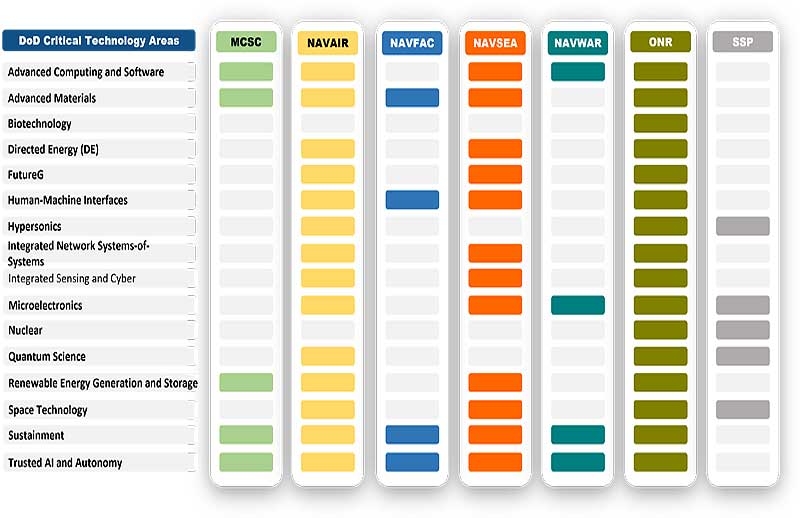 The Department of the Navy's investment in technology priorities is driven by SYSCOM-unique mission needs and requirements which are issued as topics and align with the Office of the Under Secretary Defense, Research & Engineering Modernization Priorities.